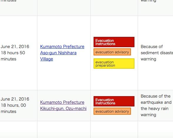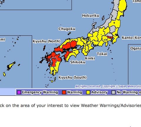 Warnings: http://www.jma.go.jp/en/warn/ Evacuation notices: http://crisis.yahoo.co.jp/evacuation/43/