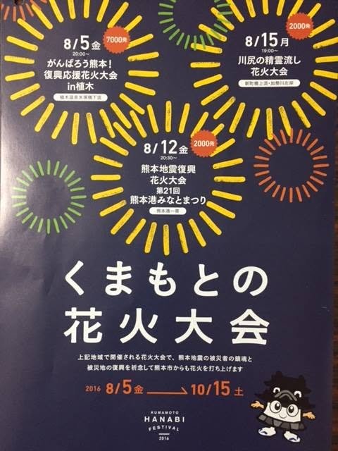 A note from the Kumamoto International Pyrotechnic Desk: Below please find attached a list of the three main firework events planned for summer, all of them conveniently located far from where my dog lives: August 5 in Ueki, 12th at Kumamoto Port, and 15th in Kawashiri. In addition, there will be firework displays in Tamana on 8/5, in Kikuchi on 8/6, and in Hitoyoshi and Yamaga on 8/15. Detailed info can be found here. - William