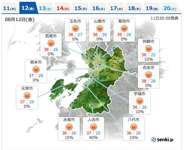 The forecast for Friday is 37 C (98.6 F) for Kumamoto City and 39 C (102.2 F) for Kikuchi. – Kirk http://www.tenki.jp/forecast/9/46/