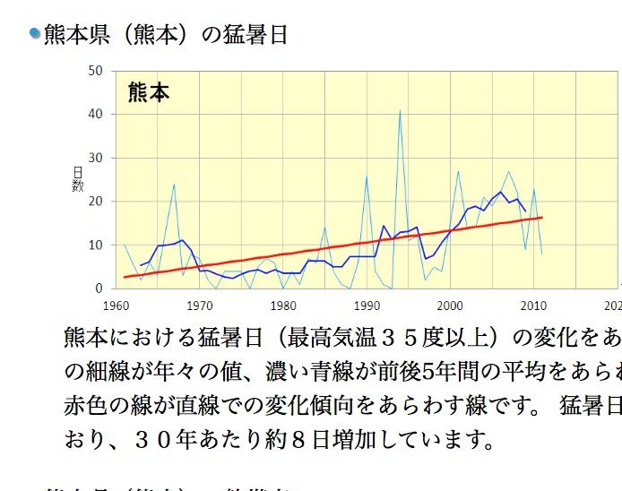 This year, records have been set all over Japan (including Kumamoto, of course) for the number of days over 35 C (95 F). I’ll write more about that later but this graph helps to put the information in historical context. The light blue (somewhat faint) line represents the number of days over 35 C in each year. The dark blue line represents the 10-year average (5 years before and 5 after) for each year. The red line shows the overall trend. This data from the JMA (Japan Meteorological Agency) is presented as evidence of global warming.