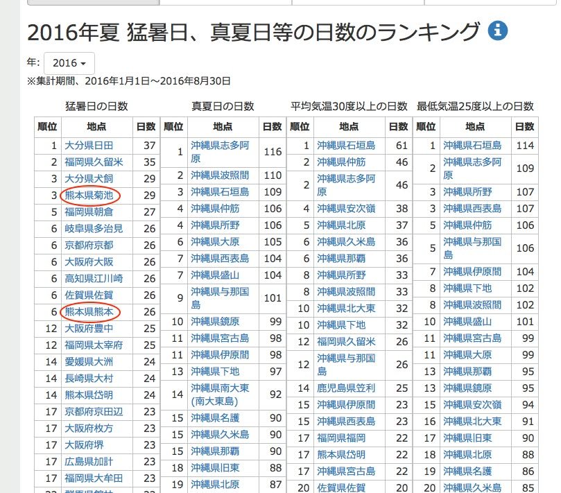 After a few cool days, warm weather has returned. But, it doesn’t look like we will go over 35 C (95 F) today so, for the time being, Kikuchi’s record of 29 days over the 35 C mark (the moshobi or “scorcher” line) should remain the same. As you can see in the graphic, 29 days of 35 or higher puts Kikuchi in a tie for the number three spot and the Kumamoto City area is tied for 6th with 26 such days. If you go to the web site and check out previous years, I think you’ll find that it’s quite unusual for Kumamoto to be ranked so high in the “scorcher” competition.