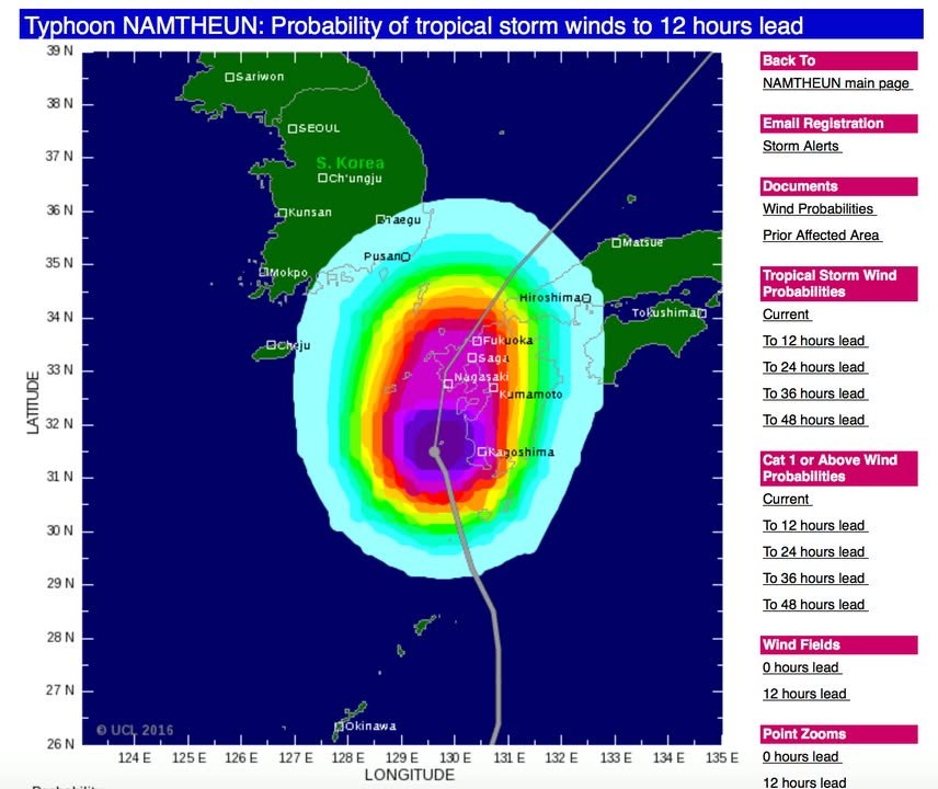 Amakusa and western Kumamoto will probably experience tropical storm winds in the next 12 hours. Take care! – Kirk http://www.tropicalstormrisk.com
