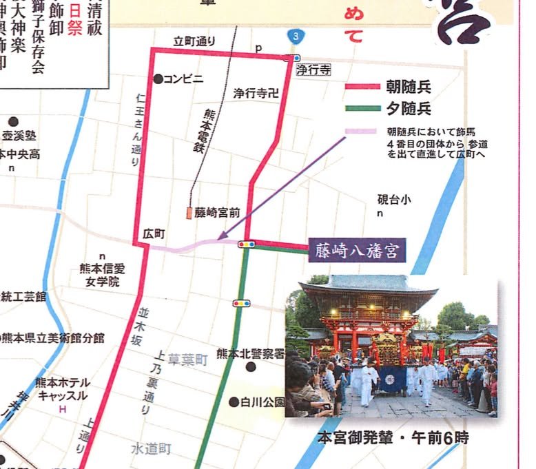The Fujisakigu Reitaisai, Kumamoto’s biggest festival, reaches its peak tomorrow with the main parade (zuibyo gyoretsu). Here’s a link to a pdf that shows the route and also lists the times (though only in Japanese):