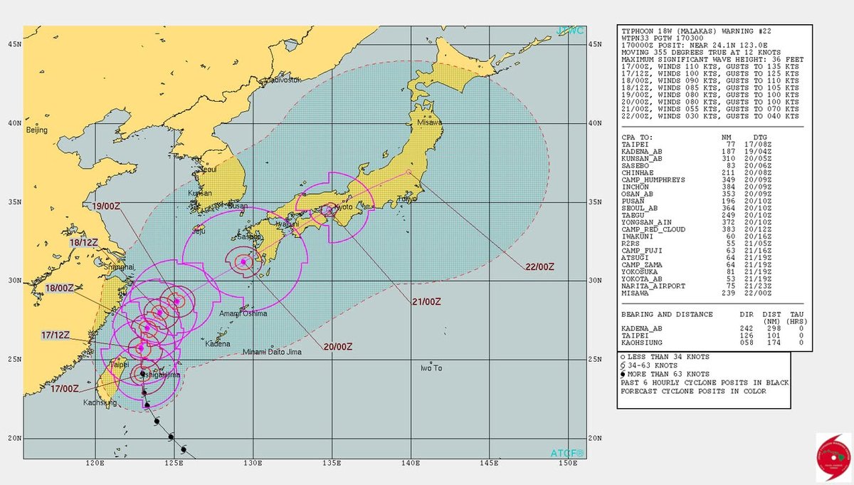 Update on typhoon 16: USNO had charted its course as far south as the tip of Kag…