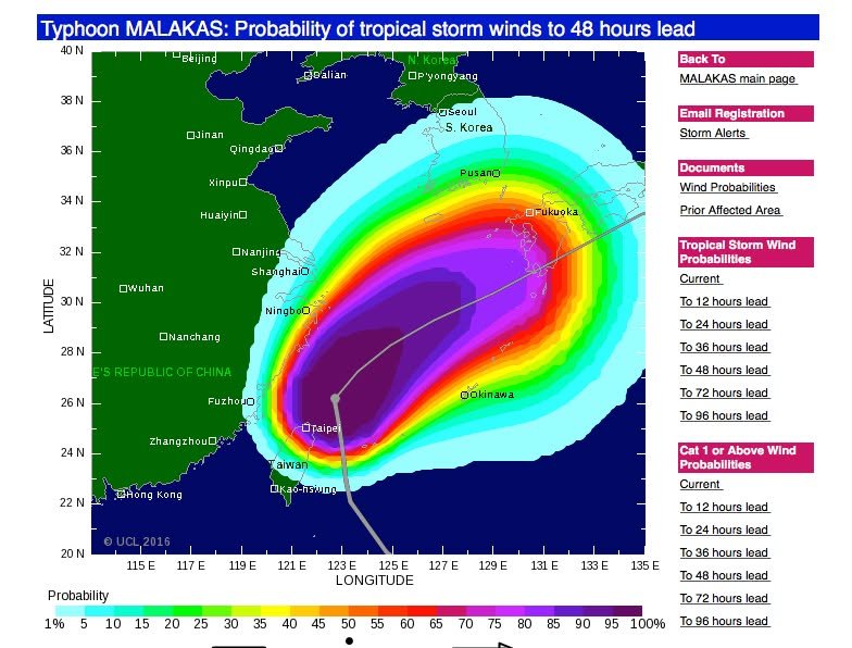 P.S. The probability of tropical storm winds is so high that it’s hard to see the outline of Kyushu on the map. The border between the purple and red part of the predictive image is about where Kumamoto is.