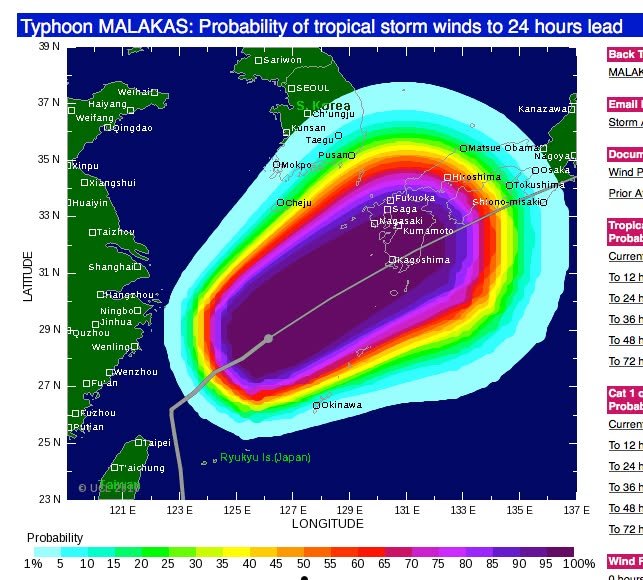 According to Tropicalstormrisk.com, we are almost certain to experience tropical storm winds in the next 24 hours. Category 1 winds will significantly less likely for us but may hit the Kagoshima area.