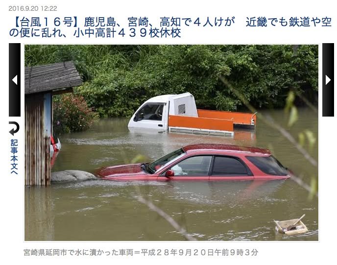 The typhoon has left our area and, thankfully, it doesn’t seem to have caused major problems in Kumamoto Prefecture. Miyazaki, however, was not so lucky. There was both flooding (e.g. the image from a Sankei Shimbun article I have appended) and wind damage. As I wrote earlier, when typhoons come from the south, their counterclockwise spin makes their impact greater on the east side of Kyushu than on the west, where we are. I suspect that the bad results for Miyazaki were due to the fact that the wind and rain that hit them was coming directly from the sea. By the same logic, Kumamoto is more vulnerable when typhoons come from the west or northwest.