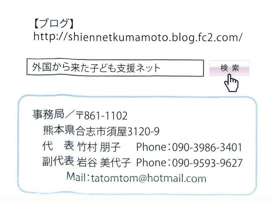 I learned recently that there is a non-profit organization in Kumamoto that was established to help children and young people of mixed roots study Japanese, finish their homework, and perhaps even more importantly interact with teachers and other young people that understand the challenges, both academic and interpersonal, that children of mixed roots often face in Japan. My daughter has been helping out there recently and saying “if only I had known about them when I was in school!” If you are the parent of a child whom you think might benefit or would be willing to help as a teacher or supporter, please contact the groups founder and representative, Tomoko Takemura, at the e-mail address you see in the 4th image.