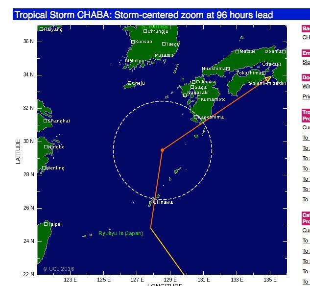 William has already posted about the typhoon that is approaching but I’d like to chime in too. The image you see is the prediction for 96 hours (4 days) from today. That would be Tuesday night. The good news is that the predicted route seems to be far enough south that Kumamoto would not get the worst of if (though that is bad news for Kagoshima). On the other hand, the bad news is that the prediction is for a VERY significant storm – a category 3 – when it is closest to us. Hurricane Katrina, which devastated New Orleans in 2005, was a category 3 storm when it made landfall. (It had been a category 5 but, at the time of landfall, it had weakened to a 3.) So, a category 3 storm would be significant. I’m hoping that it turns out to be milder than expected and that it misses Kyushu entirely but I think it’s wise to be aware that this storm system may turn out to be very dangerous. More to come . . .