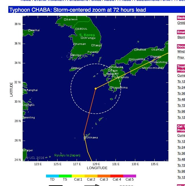 If current predictions are correct, it looks like Kumamoto will be hit by a strong typhoon early in the morning on Wednesday. I checked the Japanese JMA site and it also indicates that the storm system should pass over Kumamoto before daybreak on Wednesday morning. Currently, TropicalStormRisk.com (see attached image) says that the storm is predicted to be transitioning from a Category 3 (winds of 178-208 kilometers per hour) to a Category 2 (154-177 kph) as it moves over Kumamoto. Of course, these are just predictions; no one knows for sure exactly what will happen. I’m hoping for the best but it’s probably a good idea to err on the side of caution and assume that we will be hit by a very significant typhoon.