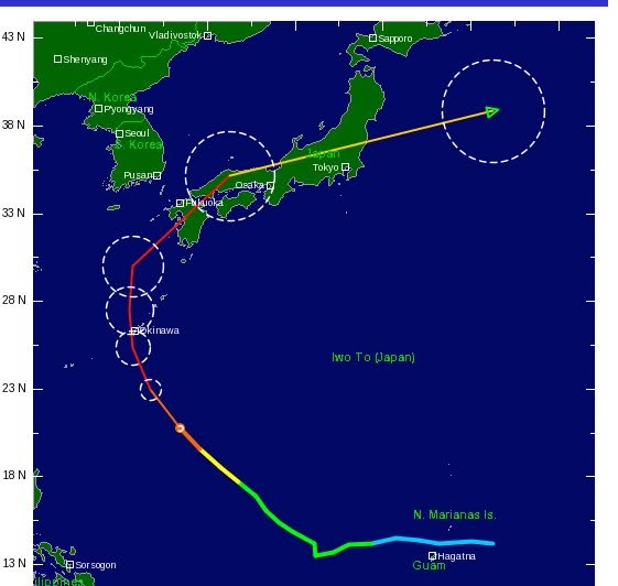This shows a category 4 typhoon (one step away from a “super typhoon”) making a direct hit on Kumamoto in 60 hours (early Wednesday morning).