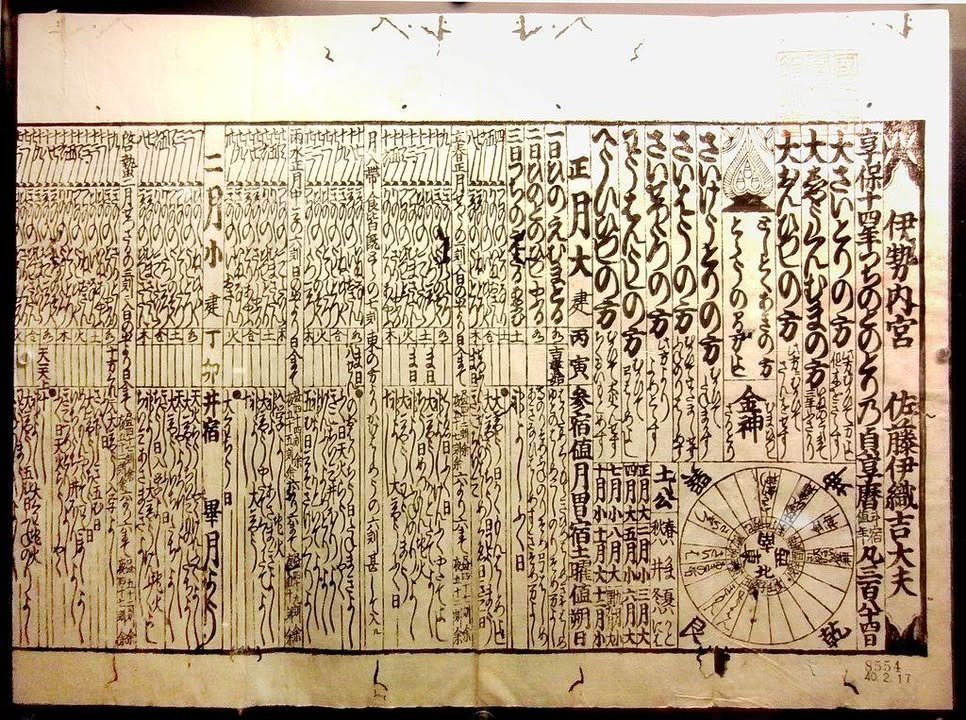 Below left is a calendar from 1729 (try and figure that out!) and right is an official pamphlet explaining the transition to the Gregorian calendar from 1872.