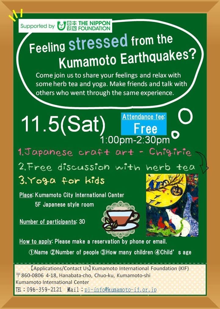 Here’s an announcement from the Kumamoto International Foundation about an event scheduled for Nov. 5th. I think the “Japanese craft art (chigirie)” is a kind of paper tearing art. With the art and also yoga for kids, it looks like a particularly good event for families with kids.