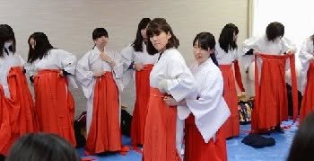 Scoring a job as a miko (巫女, shrine maiden) for the New Year’s rush is highly coveted among upper-grade high school and college students; not only does the position add prestige, it also supplements the otoshidama (お年玉、New Year’s cash gift - which, at their age, tends to fall off precipitously, if not in amount, in accordance with need). Here, Kumanichi reports on young women attending an orientation at Kato Shrine, learning how to don their hakama. One woman was quoted as saying, “The traditional dress awakened me to the solemn atmosphere.”