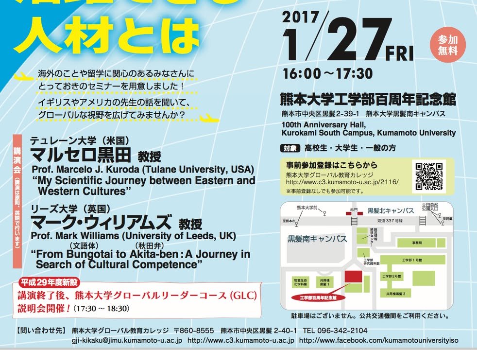 Sorry for the late notice but tomorrow a couple of lectures will be given in English at Kumamoto University by two world-class scholars. Anyone who is interested is encouraged to attend. The titles of the lectures are in English and a Japanese note indicates that the lectures will be in English “for the most part” (原則として).