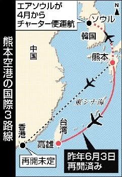 These international flights will add to the Gaoxiong, Taiwan charter flights; flights to Hong Kong, discontinued since the quakes, have remained so. I hope that at some point regular passenger service between Kumamoto and Seoul will resume.