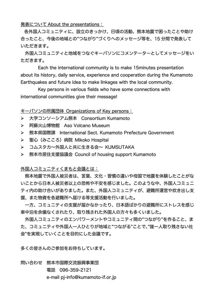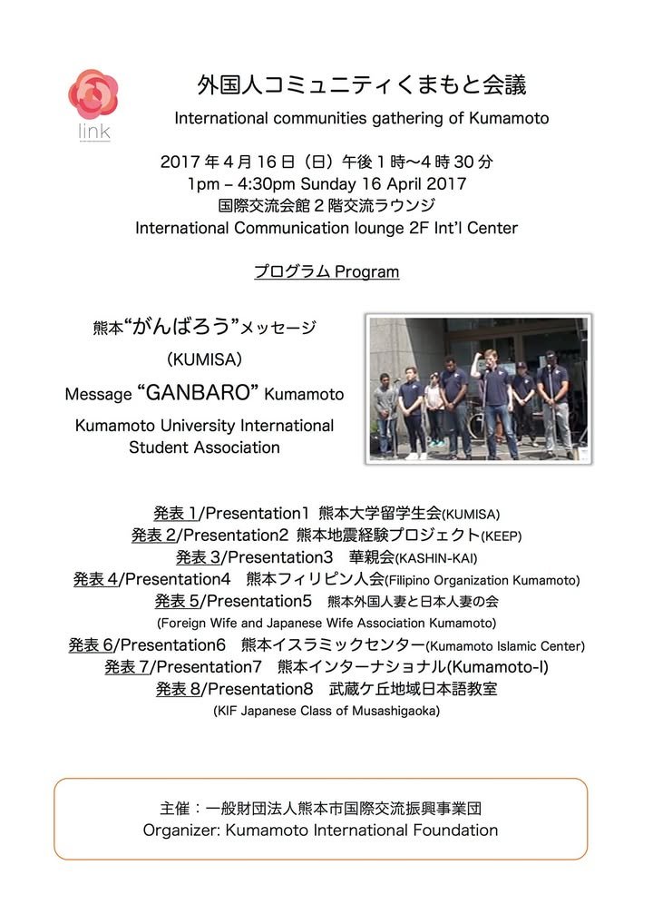 I’ll be giving a little presentation this Sunday about how this page responded to the earthquake. Actually, most of my 10 minutes or so will be about how Kumamoto City and Kumamoto Prefecture could do a better job of making information accessible to the non-Japanese community. I’ll be one of eight speakers. Please see the images for details. By the way, I’m told that English interpretation will be provided when presentations are in Japanese and vice versa regarding English presentations.