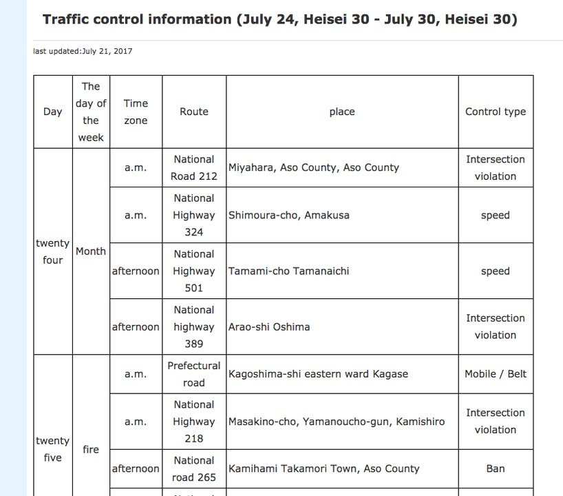 I’ve been in Japan quite a while but there are still some aspects of Japanese culture that I have trouble understanding. One is official announcements about where certain traffic violations will be enforced. The image is of a Google Chrome translation of