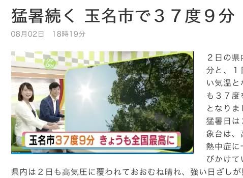 Tamana (about an hour’s drive north of Kumamoto City) had the highest temperature in Japan today. As you can see in the image, the temperature was 37.9 C or just over 100 F. This was the second day in a row for Tamana to be at the top of the list of “hot spots” in Japan. – Kirk