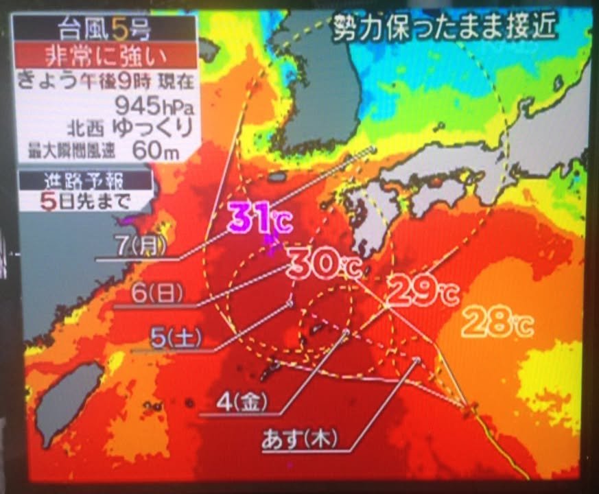 This is an image from a TV show (News Station) that I recorded last night. The point is that ocean temperatures around Kyushu are high and that this means that typhoon is likely to remain strong as it approaches. As I understand it, heat is the fuel that makes cyclones go so there is concern that global warming is giving rise to increasingly powerful storms.