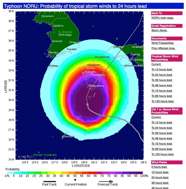 According to http://www.tropicalstormrisk.com, all regions of Kumamoto are quite likely to be experiencing tropic storm winds (see key in second image) in about 24 hours. Over the years, my experience with this site (TropicalStorm.com, that is) is that actual events are sometimes considerably less severe than predicted but, importantly, are sometimes more severe. Since weather and climate are chaotic systems (that is, systems that are highly sensitive to initial conditions), prediction is never an exact science. It’s better to err on the side of caution.