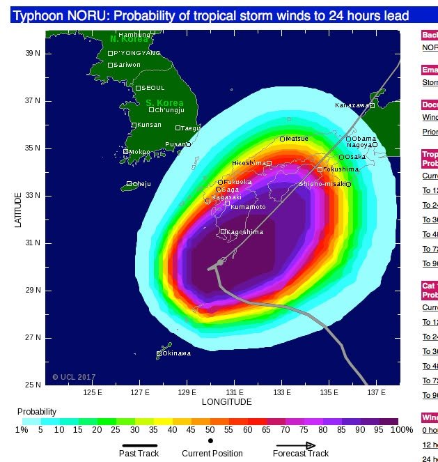 According to TropicalStorm.com, the anticipated path of the storm has shifted to the east. That’s good news for us. The site still says that we’re likely to get some strong winds, but I don’t think they take topography (the Aso mountains, etc) into account when they generate these maps. JMA is still warning of strong winds and rain in our area so it’s probably premature to plan a picnic for this afternoon but, as Joe suggested, you may want to take advantage of the relatively mild weather while you can. – Kirk