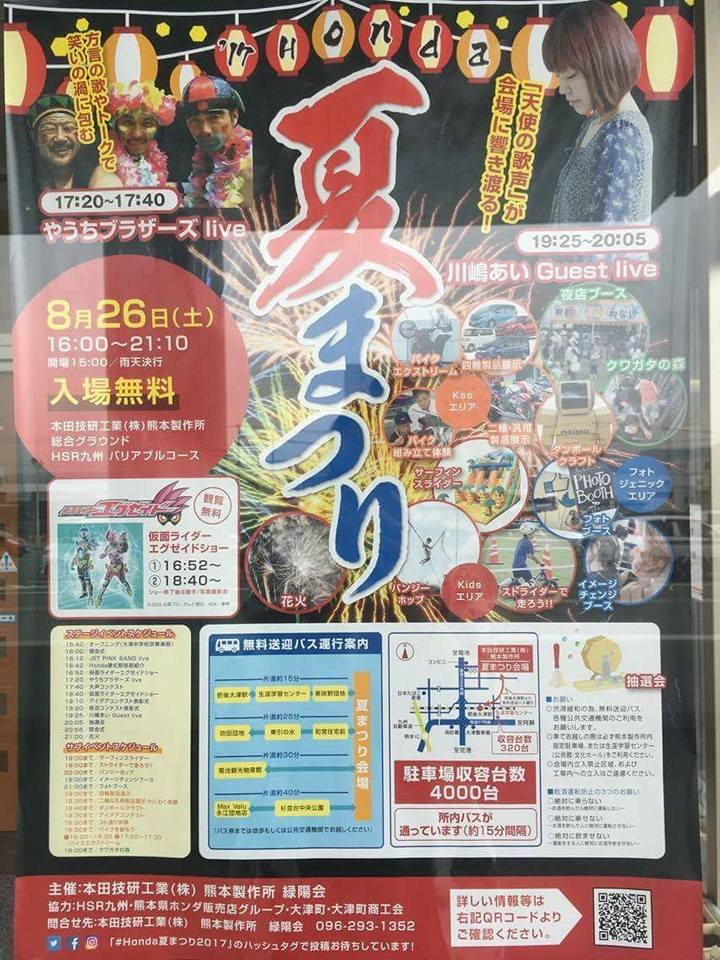 For those of you who will be in Kumamoto this weekend, the Honda plant in Ozu will be holding its annual summer festival on Saturday. Festivities kick off at 4pm and run until the end of the fireworks show, which starts at 9.