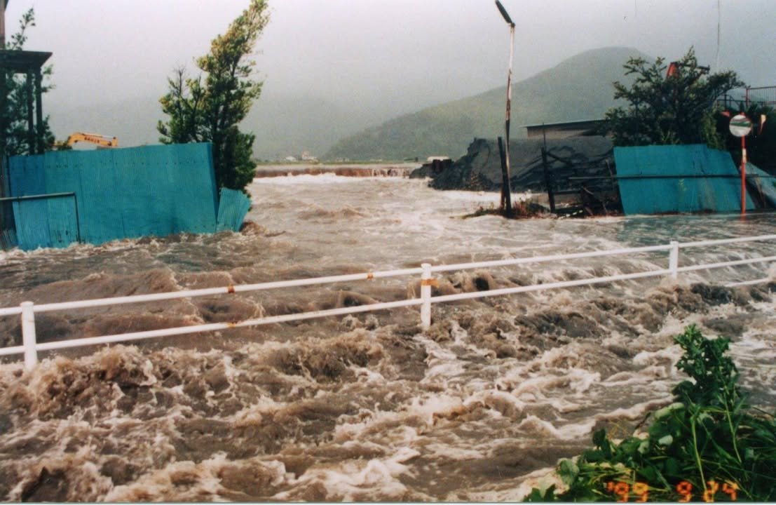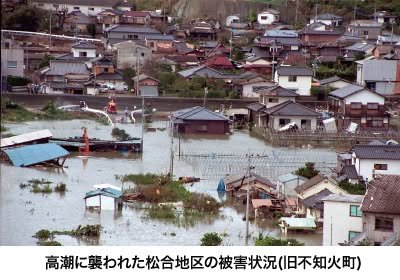 Typhoon 18 (“Jake”) came ashore over northern Kumamoto on September 24, 1999 with a barometric pressure of 930 hectopascals, dragging behind it a large storm surge. The peculiar characteristics of Yatsushiro Bay - south-facing with a very gradual slope and narrowing width - funneled the surge into a tsunami-like wave that barreled through the sea until it hit the cul-de-sac, the fishing town of Shiranui (不知火 - interesting name). This phenomenon has occurred in Shiranui periodically through history. Images of the surge and its aftermath are shown below.