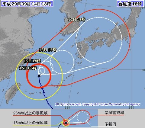 Of greater concern: The typhoon has slowed down. Originally expected to come ashore Saturday morning, that time now appears to be Saturday evening; nighttime typhoons are a bit scary. Furthermore, as it meanders over the warm East China Sea, it is strengthening - from a projected 960 HPa yesterday to 935 HPa today which, in meteorological terms, is friggin’ strong. It also appears it will take its time over Kyushu, perhaps a full day.