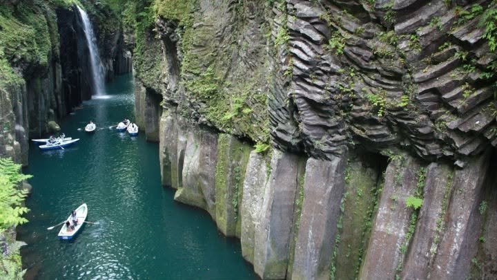 Takachiho gorge displays basalt columns from the earlier eruptions topped by tuff deposited when Aso went complete kablooey in its grand finale 90,000 years ago; the two rock types are clearly seen in the below photo. Takachiho has made the list of the 11 most beautiful basalt columns in the world. See the article below for more info and beautiful photos. - William