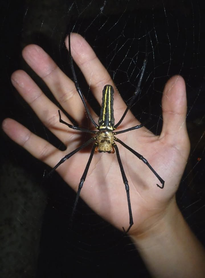 Orb webs of female jorōgumo can reach one meter in width, and their structures are unusual: in addition to the central orb, there are layers of irregular, thick, criss-crossed silk on either side, probably to slow down autumn’s large prey.