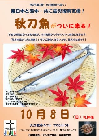 The Oe chapel of the Japan Lutheran Church will hold its annual sanma festival to benefit both Tohoku, which has graciously provided the sanma, and Kumamoto disaster victims, after services (noonish) this Sunday, 10/8 (take home or eat there; the chapel has a cafe cozily decorated with English antique furniture). The chapel is behind Kyushu Gakuin, everyone is extremely friendly, and all are welcome. - William