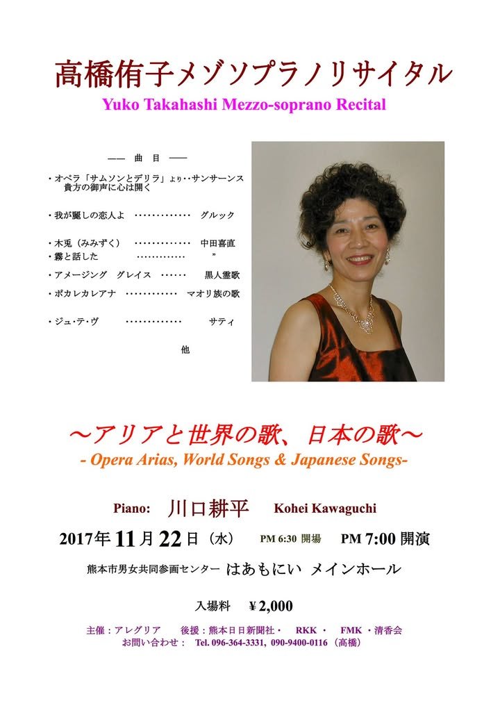 Kumamoto native Yuko Takahashi’s annual recital will be held on the 22nd of this month. Yuko studied in Italy and currently resides in Auckland, New Zealand. She is married to Farrell Cleary, who advised me as I started Kumamoto-i (the mailing list that led to this Facebook page) some 18 years ago.
