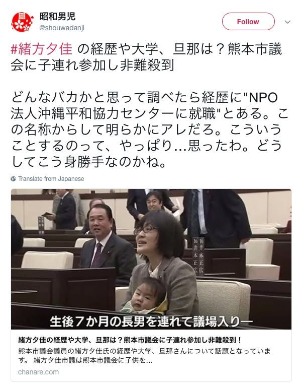 I wrote earlier that I was concerned about what misogynistic trolls on the internet would do to Ms. Ogata. Curious about what was being said I searched Google with the key words “twitter” and “緒方夕佳” (Ms. Ogata’s name in kanji). This is the first (!) tweet that came up. The tweeter, Showa Danji (a fictitious name) launches an ad hominem attack at Ms. Ogata. In other words, instead of posting about the issues at hand, he attempts to discredit her because of her association with an NPO called the “Okinawa Peace Assistance Center”: