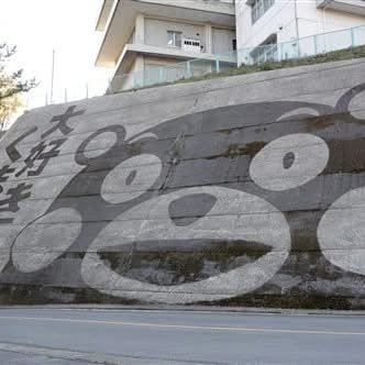 Anyway, crossing whichever bridge will bring you to an extremely steep incline which will not end until you reach the far-away Yabe basin, and to your right, you’ll see a large dam which has somewhat tamed the river. This area is a town called Uneno (畝野), which literally means “furrow fields” as the steep slopes only allowed contour farming. The area has degraded to mostly cedar plantation today (though its stone terraces remain), but the dam is still under charge of Uneno, and to beautify its concrete walls after a recent cleaning, they opted to paint a large Kumamon panoramic.
