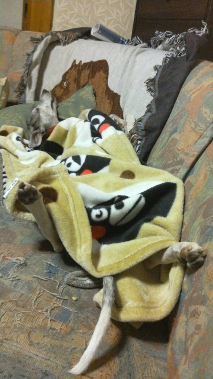 Breaking news! Editor William's whippet receives a Kumamon blanket from his daug…
