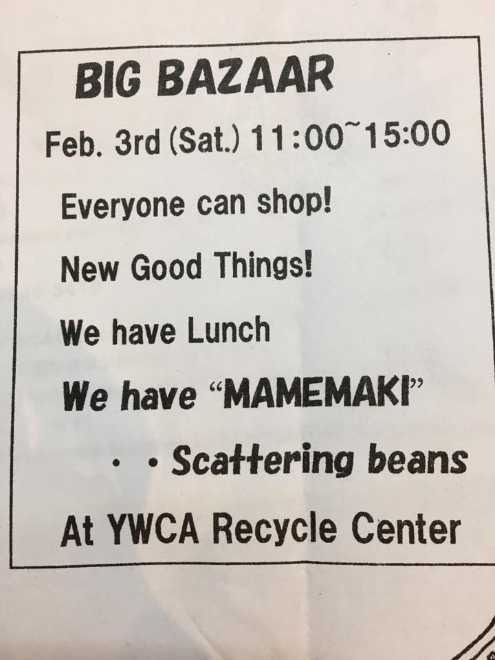 For those who live around Kurokami area. YWCA has event on Feb 3rd (Sat) at 11:00-15:00.