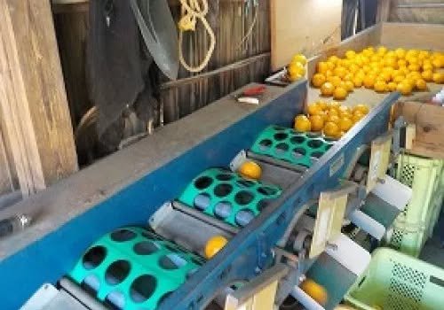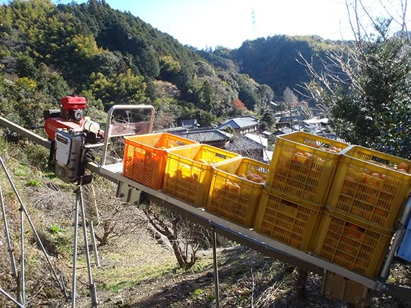 Answer: mechanization! Picking is done by hand, after which the mikan are whisked down the mountain by a mikan monorail (ミカンを運ぶモノレール) to a size sorting machine (自動選果機、jidōsenkaki), deposited directly into boxes, and sent to market. Both devices are shown below.