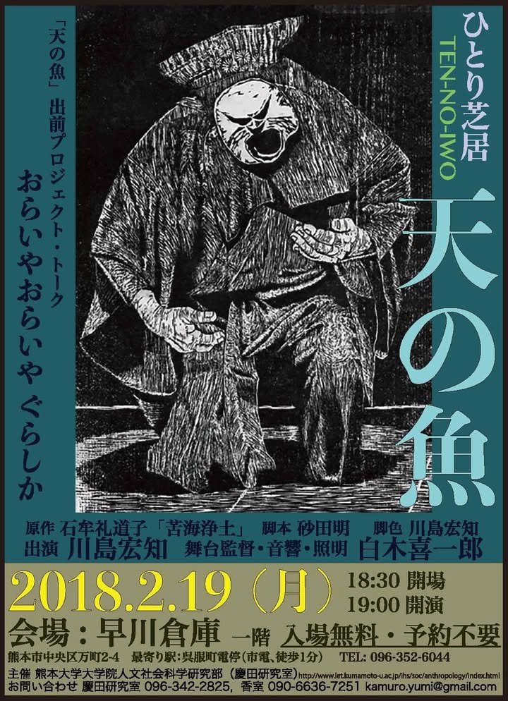 Gofuku Machi (呉服町) is in what was once the commercial center of Kumamoto, though it has today deteriorated into gentile delapidation. A wattle-and-daub storehouse known as Hayakawa Souko (早川倉庫)was built there in 1915 and remains in use as an event space. On Monday, February 19 from 7:00 PM, an actor named Kawashima Kouchi (川島宏知)will present a solo excerpt of the novel entitled “Fish of Heaven” (天の魚, Ten no Iwo). This excerpt was written several decades ago, has won several literary awards, and has been performed around the globe.