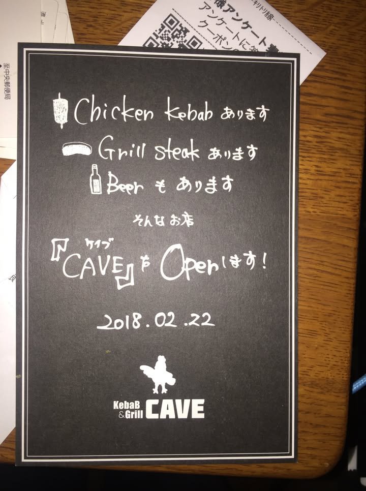 The new shop is called Cave and is next to the Core 21 pachinko parlor. I’m not sure if this is standard pricing or an opening special, but we had a pita kebab, soup and a drink for 500 yen.