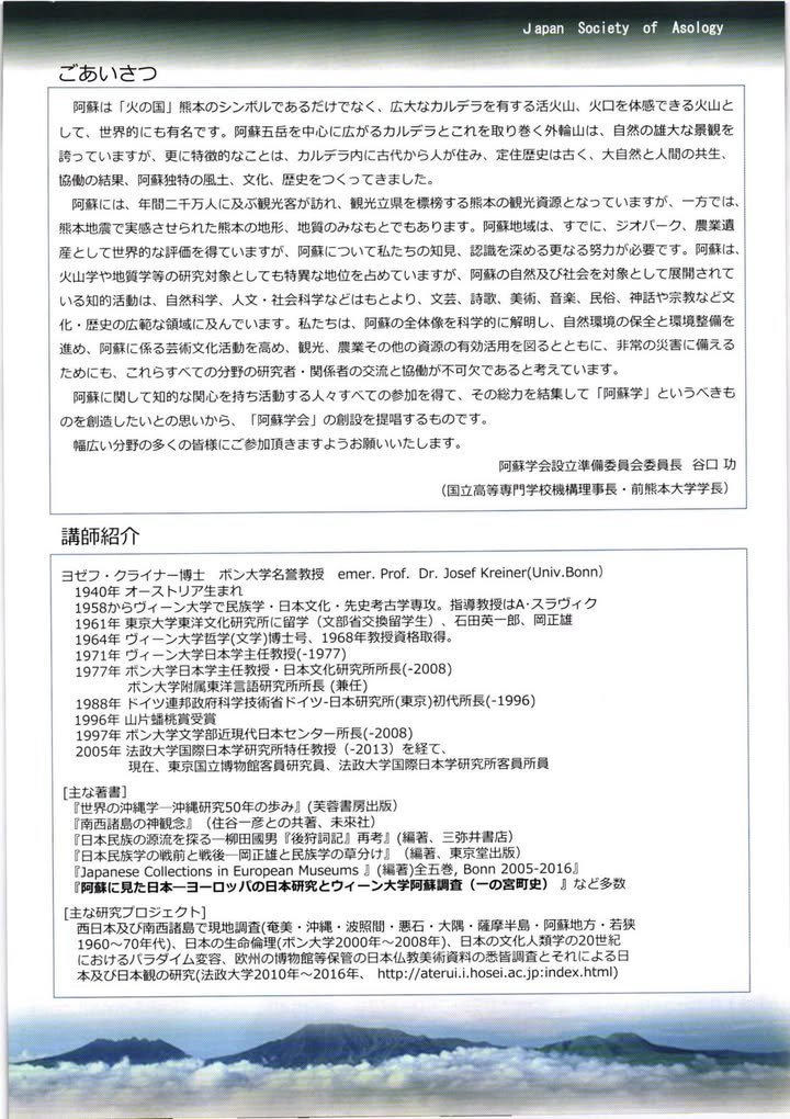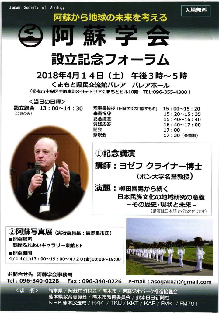 Joe Tomei here. As Kirk noted, things are heating up on the tourist front at Aso (perhaps not the best metaphor, but I trust you understand) and on 14 April, there is a program featuring a talk by Austrian Japanologist Josef Kreiner, emeritus professor from Bonn University. Attached is a flyer for the event. The talk is free and will be in Japanese, and his topic is “The study of regional Japanese culture from Kunio Yanagita onwards” (apologies for my poor translation)