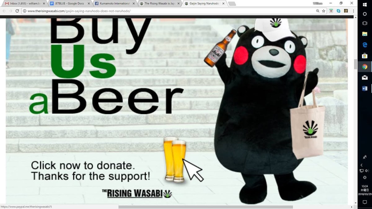 The Rising Wasabi is a humor site in the vein of The Onion which pokes fun at Japanese society and the myriad ways gaijin try to navigate it; I find it most often hilarious. Their use of Kumamon in a recent fundraising ad caught my eye. I guess the idea is that, if you wire them money via Pay Pal, they’ll hand it off to Kumamon, who will run to the nearest conbini and bring back a few bottles of Asahi. That is not entirely unimaginable.