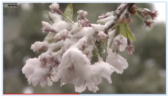 This is a picture of snow-covered sakura blossoms – a rare combination – that was taken in the Aso area today. NHK reported the snow in the Aso area on its nationally broadcast evening news program today. You can see another video news segment (the one from which I took the image of the snow on the sakura blossoms) here: