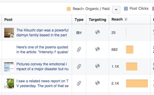 I know that Japanese swords and other artifacts relating the Japan’s samurai culture are not everyone’s cup of tea, so to speak, but I also have found that quite a few non-Japanese are interested in topic. So, I was amazed that the Facebook algorithm chose not to show this to most Kumamoto International readers – after 7 hours, just 25 people are reported to have seen it. Normally, almost any post would have several hundred views after seven hours. (For comparison, the attached image shows, in chronological order, how many people have viewed other recent posts.)