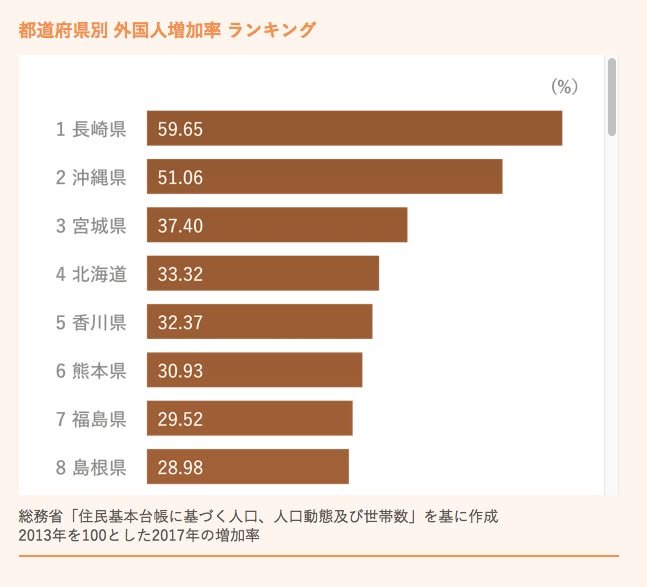 I was particularly interested, naturally, in the statistics about Kumamoto. The first map of Japan show that Kumamoto is one of a few prefectures in which the rise in foreign works has been over 30% since 2013. The brown graph provides the details, indicating that Kumamoto is ranked 6th with a 30.93 percent increase. The pink graph show that Kumamoto is also ranked 6th in terms of the percentage of the agricultural workforce that is made up of foreigners (11.99%).