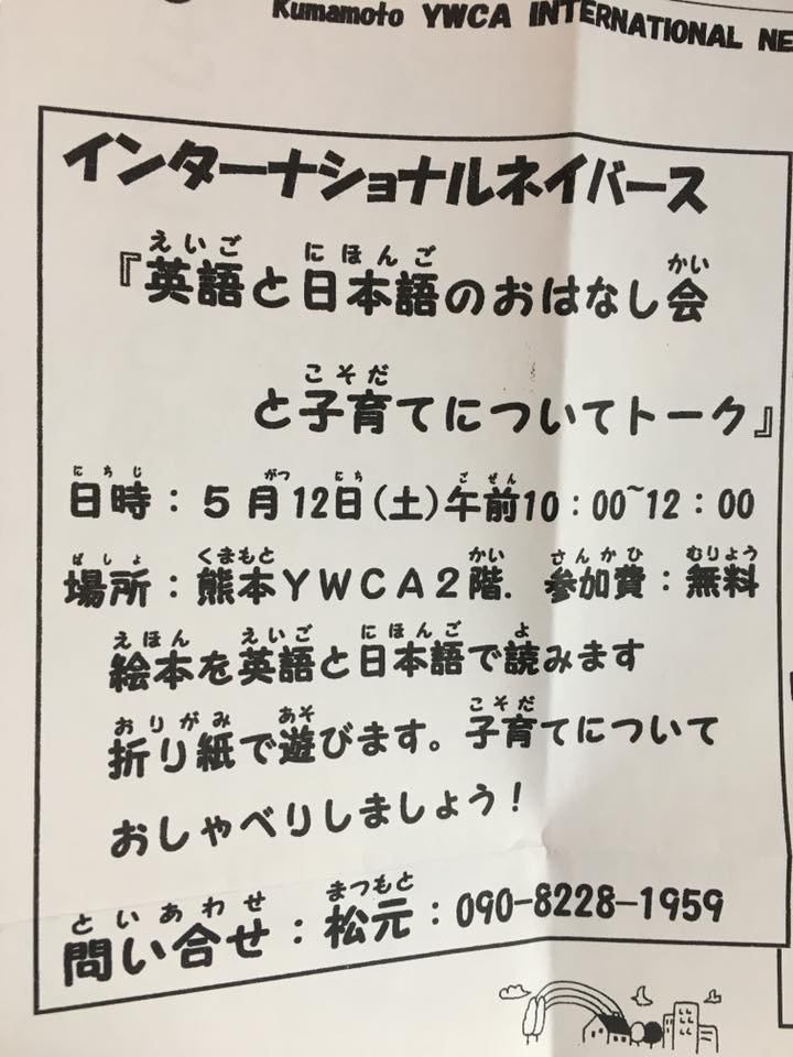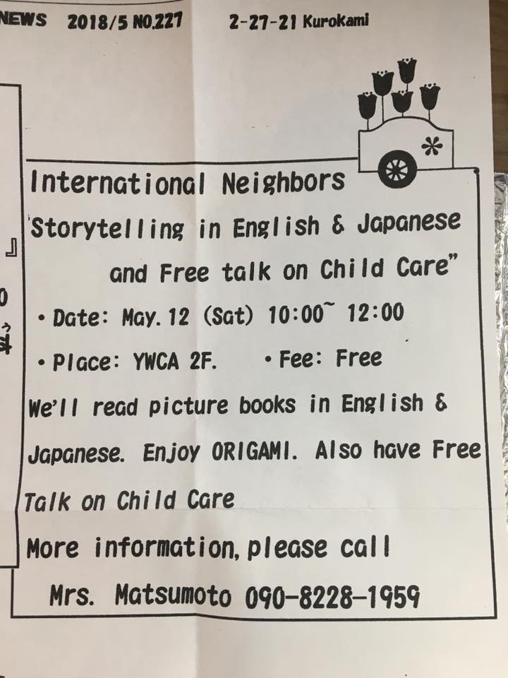 Storytelling in English and Japanese at YWCA Kurokami this Saturday, May 12. From 10-12pm