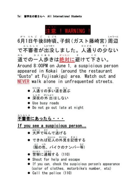 Recently Kumamoto University made a sign warning students of a ’suspicious person’ who had been bothering students in the Kokai area. So, if anyone has trouble with this person they can contact the International Education Division. He appears to be a thin man in his late 20s.