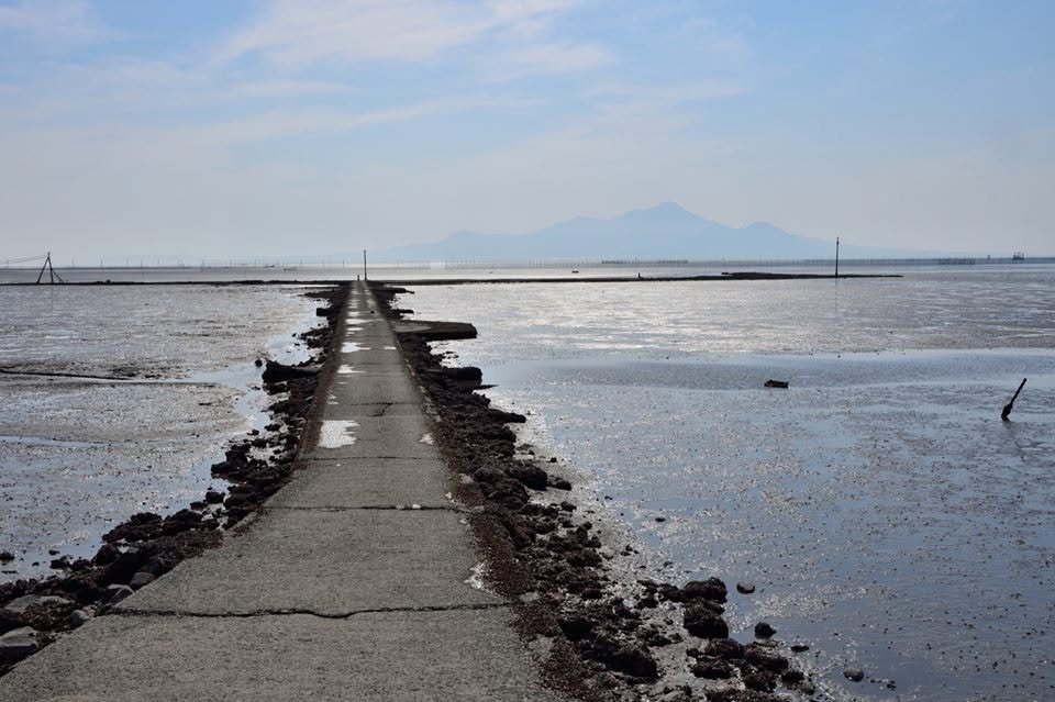 What is known as 有明海 - Ariake Sea - is less than a sea but a large inlet. Due to the tremendous amount of sediment originating from various volcanoes and agriculture, its gradient is extremely shallow, which results in a significant tidal distance, often a kilometer or more depending on the location. Feeding 130 million people also requires that the sea be a gigantic farm, with nori (laver seaweed) and asari clams the most cultivated. A problem is how to access the cultivatable areas, which resourceful fishermen have solved by creating long roads which are submerged at high tide but usable during low (timing is key here or you’ll find your car submerged).