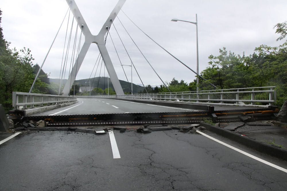 Kumanichi reports on another step in post-quake recovery (and, yes, I understand that phrase is illogical as it’s impossible to recover from damage not yet incurred): Kuwatsuru Bridge (桑鶴大橋) in Nishihara Mura, which connects to the Tawarayama Tunnel still under reconstruction, has been reopened. The photo below shows the extent of movement both vertical (the bridge towers, being anchored deeply, did not move in relation to the leading road) and lateral (look at the center lines). The bridge’s name is also quite beautiful: “kuwa” (桑) means mulberry, that plant that silkworms thrive on, and “tsuru” (鶴), of course, means crane - that of the bird variety. Apparently, construction on connecting roads will continue through late July, resulting in single-lane usage through that time. - William
