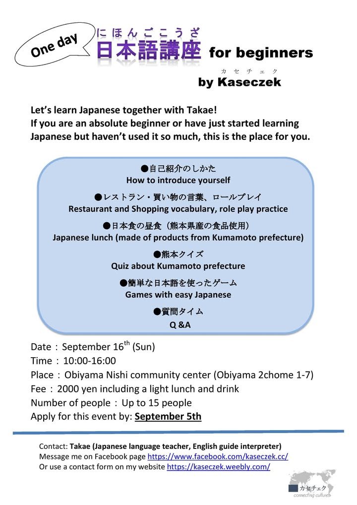=== Hello everyone. I’m Takae Fuchigami, a freelance Japanese teacher and a newly-born English guide interpreter living in Kumamoto city. I’m holding an event on September 16th (Sun.) for Japanese language beginners at Obiyama Nishi community center. In the event we will learn survival Japanese phrases in restaurants and for shopping, play games to practice very easy Japanese, and I’ll introduce some of Kumamoto culture.